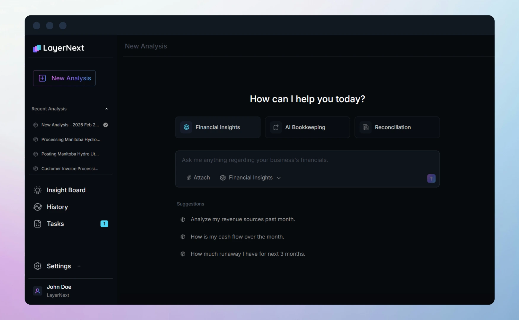 This is the default way to access LayerNext on your desktop. Enter your prompt in the input box and upload the relevant documents, such as receipts, bills, or bank statements.